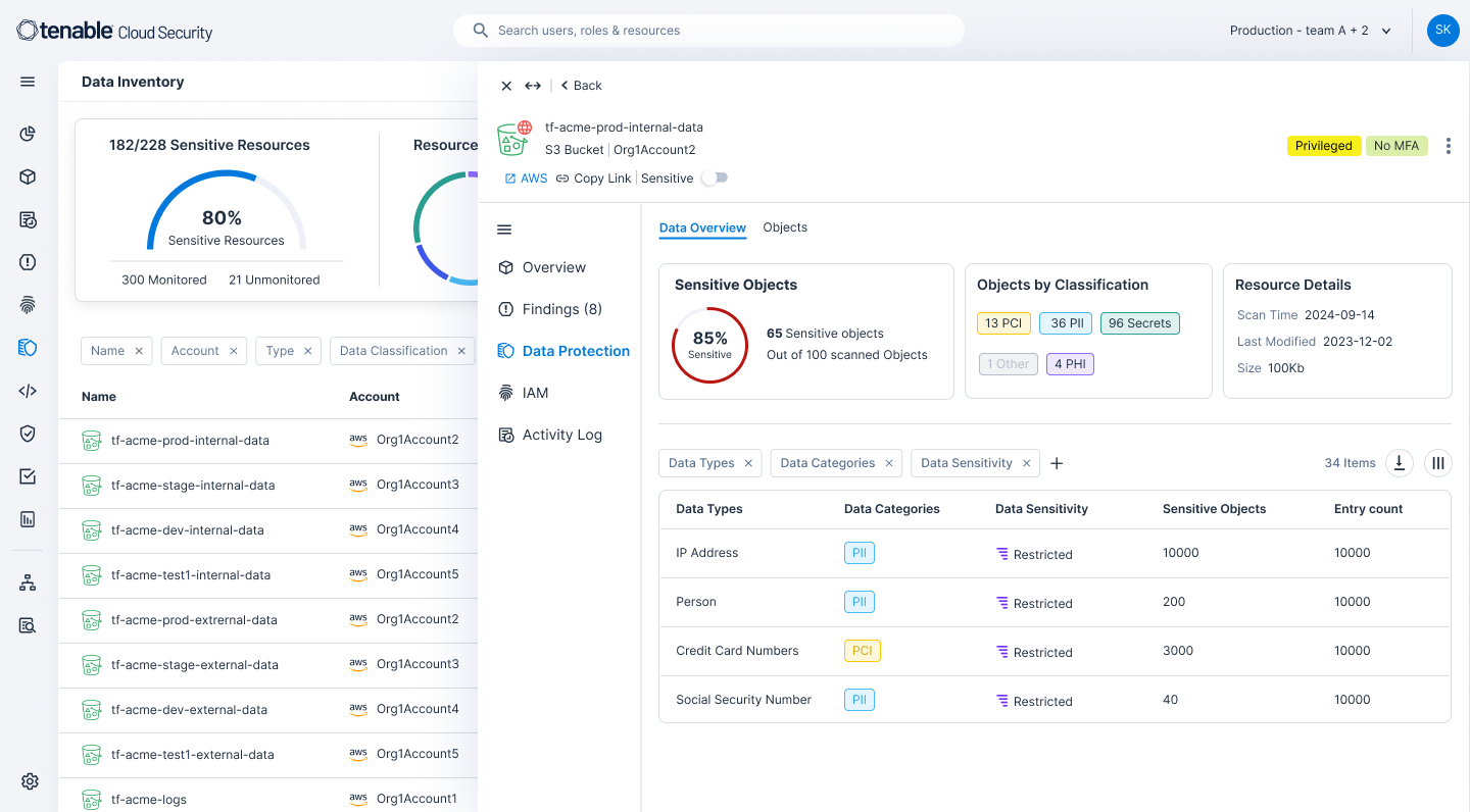 Get full visibility into where data resides across your cloud environment. From AI services and workloads to S3 buckets, Tenable Cloud Security identifies data resources using agentless API scans, classifies data findings by severity levels and then groups data into categories such as company secrets or PHI. This three-layered approach understands account context and reduces alert noise so you can prioritize the exposures that matter most to your organization's overall compliance and security posture.