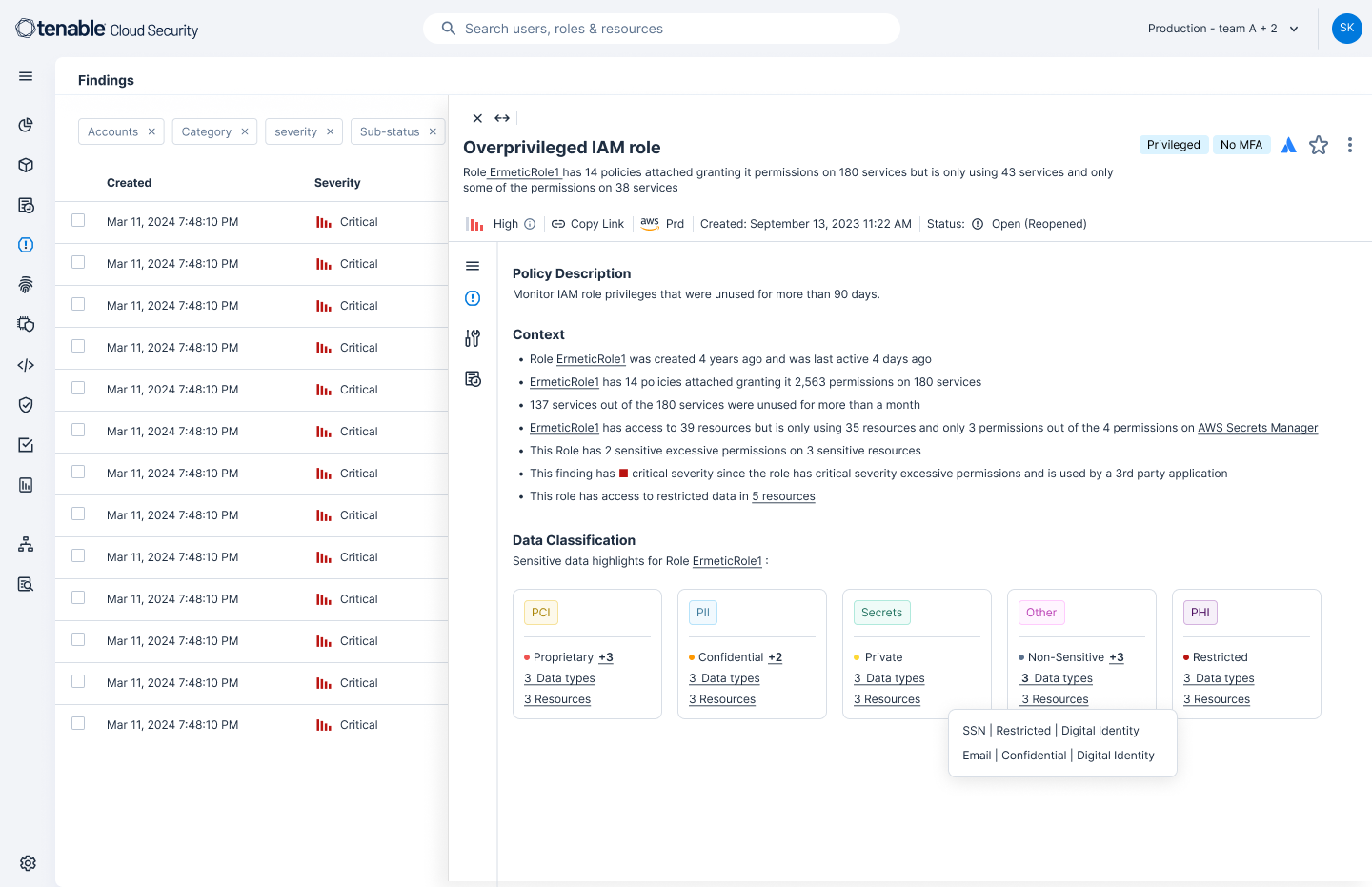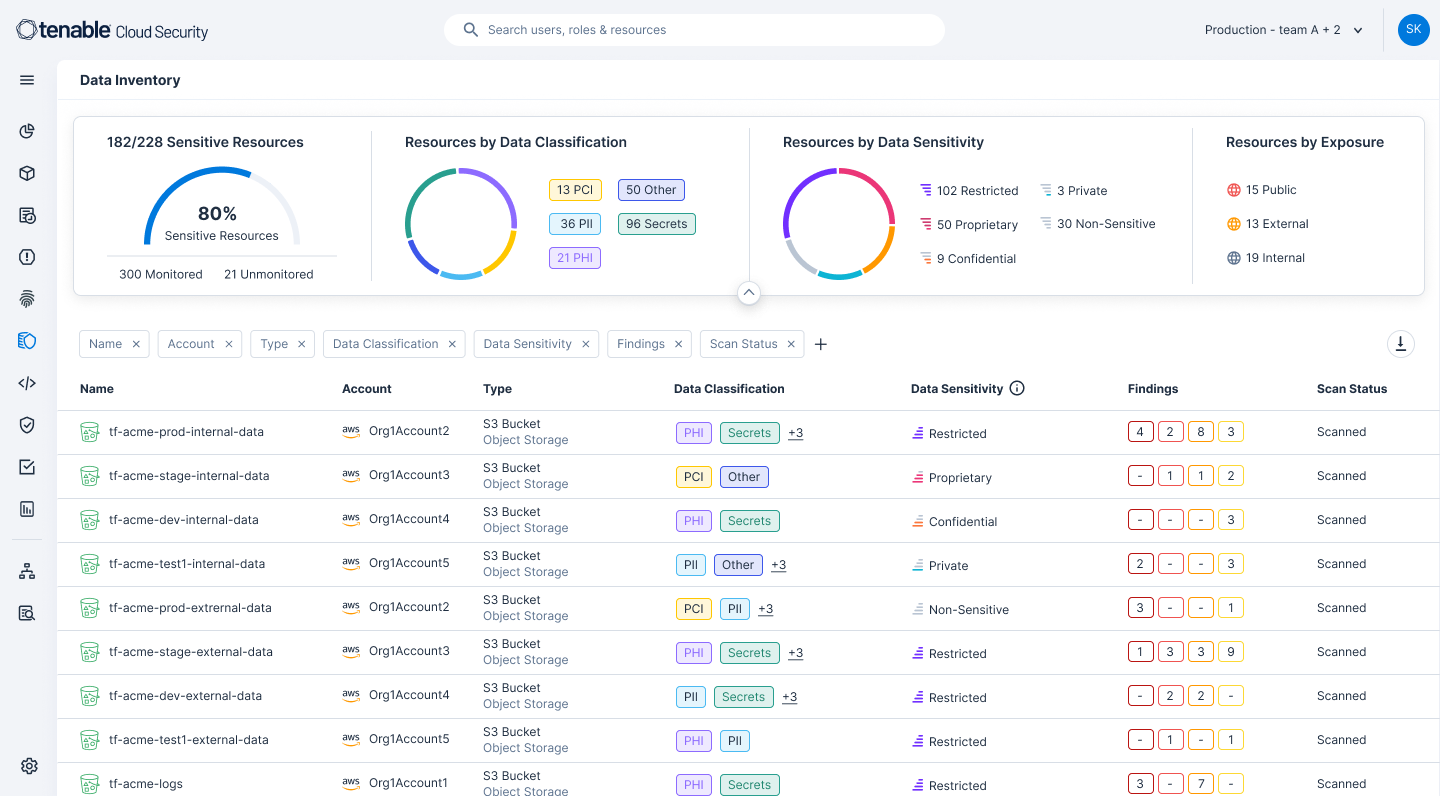 Get full visibility into where data resides across your cloud environment. From AI services and workloads to S3 buckets, Tenable Cloud Security identifies data resources using agentless API scans, classifies data findings by severity levels and then groups data into categories such as company secrets or PHI. This three-layered approach understands account context and reduces alert noise so you can prioritize the exposures that matter most to your organization's overall compliance and security posture.