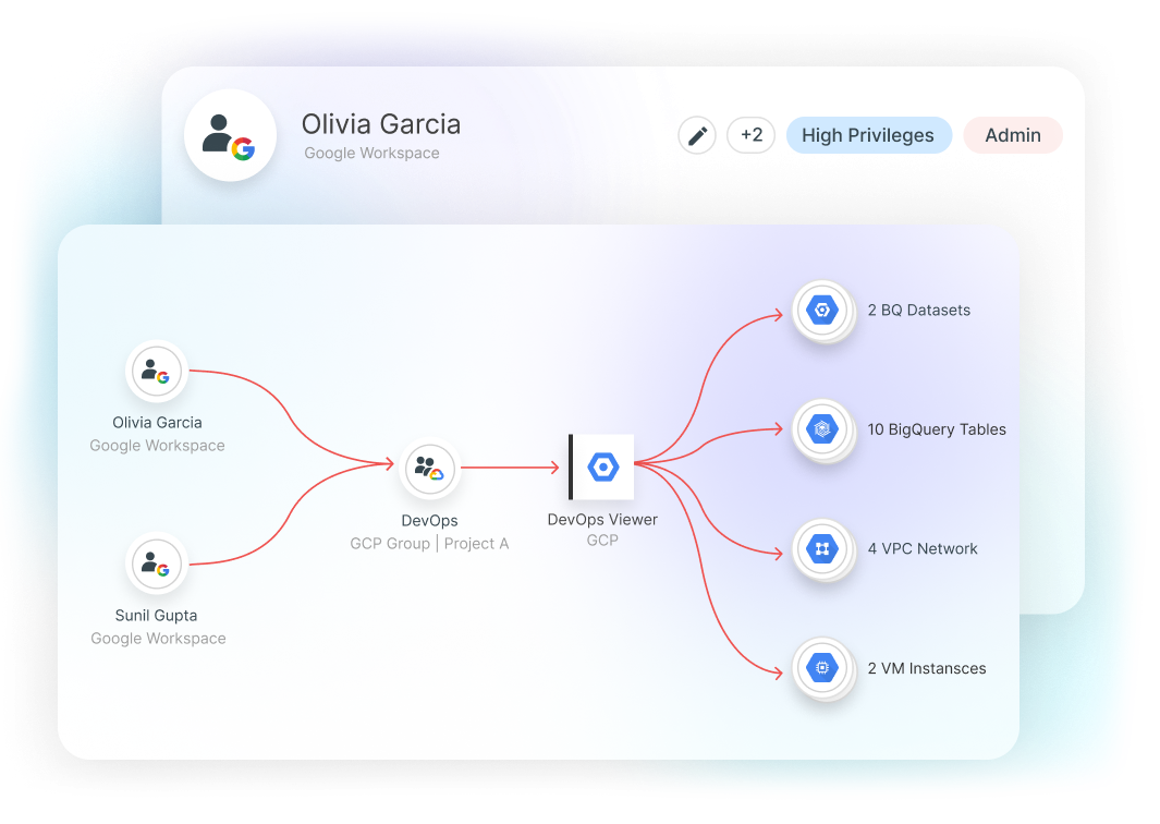 Create a behavioral baseline for each identity captured across GCP cloud audit logs so you can detect and turn anomalous findings into contextualized, risk-prioritized alerts. Get insights to assess whether an entitlement provides the right level of access based on current needs and dynamically update permissions to actively enforce the principle of least privilege.