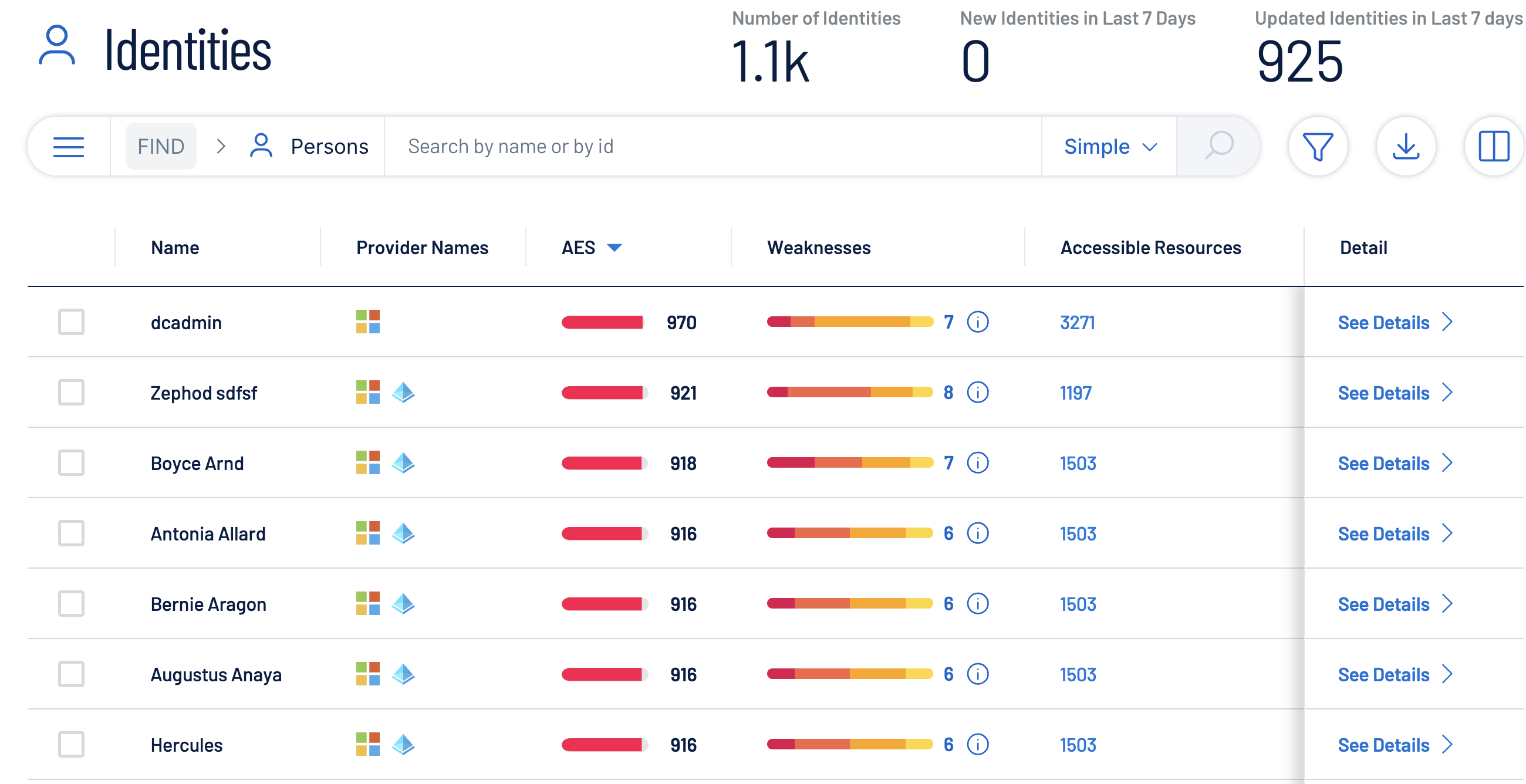 The Identity Asset Exposure Score (AES) is an AI-driven scoring system that evaluates and ranks each identity based on its risk level. It considers: