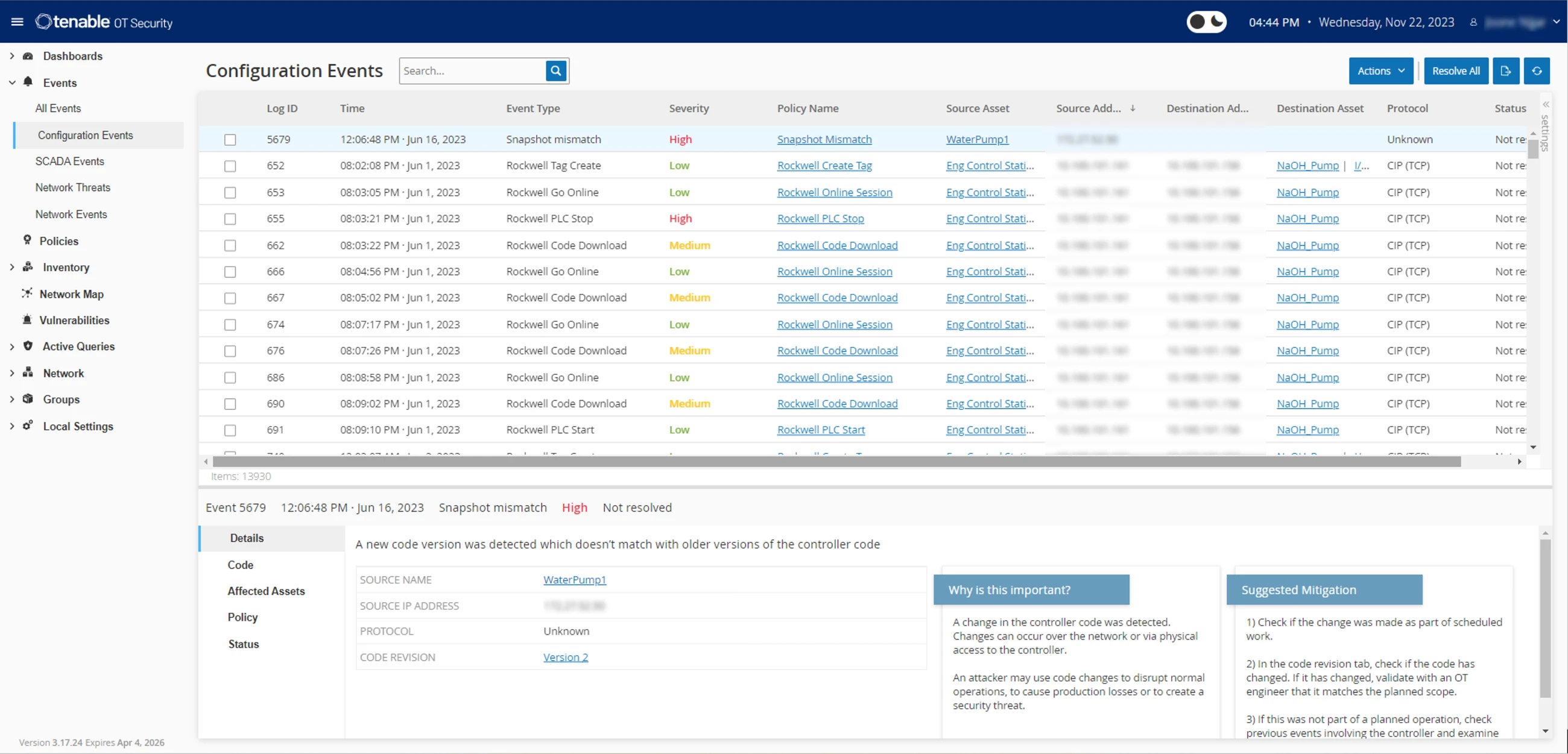 Track malware and user-executed changes over your network or directly on a device. See a timeline of device configuration changes, including specific ladder logic segments, diagnostic buffers and tag tables. Establish a backup snapshot identifying the “last known good state” for faster recovery and compliance with industry regulations.