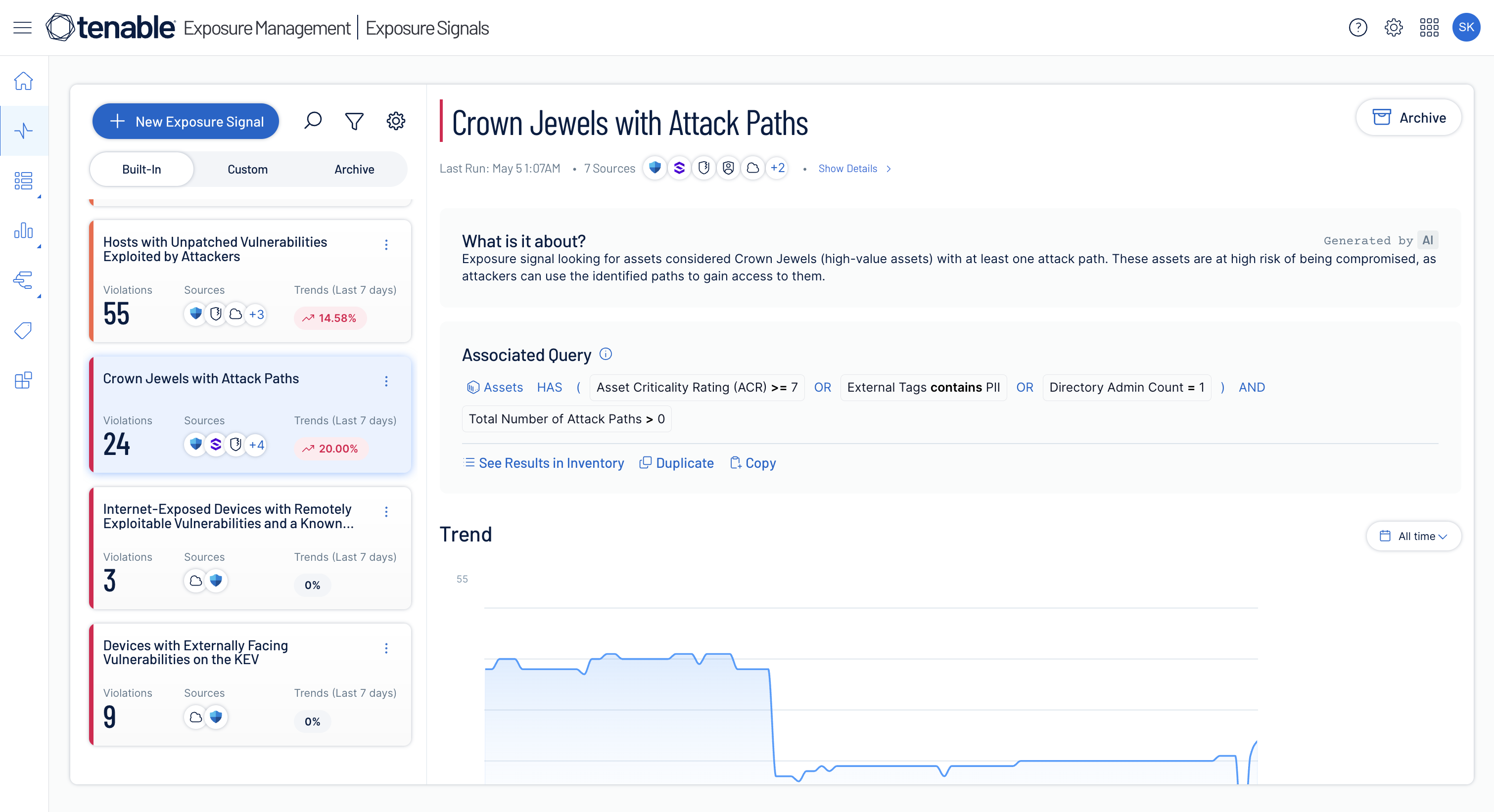 - Exposure Signals: A cross domain prioritization capability to identify toxic combinations of vulnerabilities, identities, threats, installed software and assets that amplify organizational risk. By fusing Tenable’s sensor data with risk-scoring metrics and asset context (e.g., criticality, ownership), organizations can surface high-exposure scenarios that require immediate remediation.