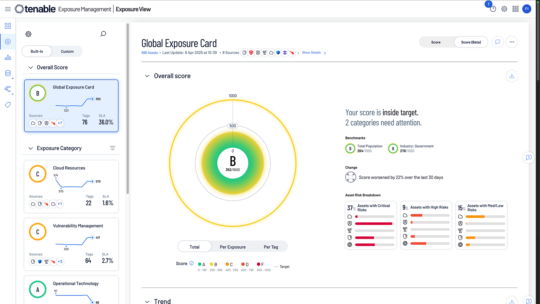 Combines integrated metrics across risk-based vulnerability management, web app scanning (WAS), cloud security, identity exposure, OT security, EASM and third-party data